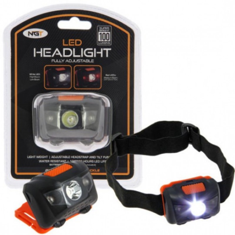 NGT LED priekiniai žibintai,tolimųjų/artimųjų šviesų funkcija. Raudona arba balta šviesa, reguliuojamas, elastingas galvos apdangalas. Atsparus vandeniui lengvas, maitinamas 3 AAA baterijomis (į komplektą neįeina).