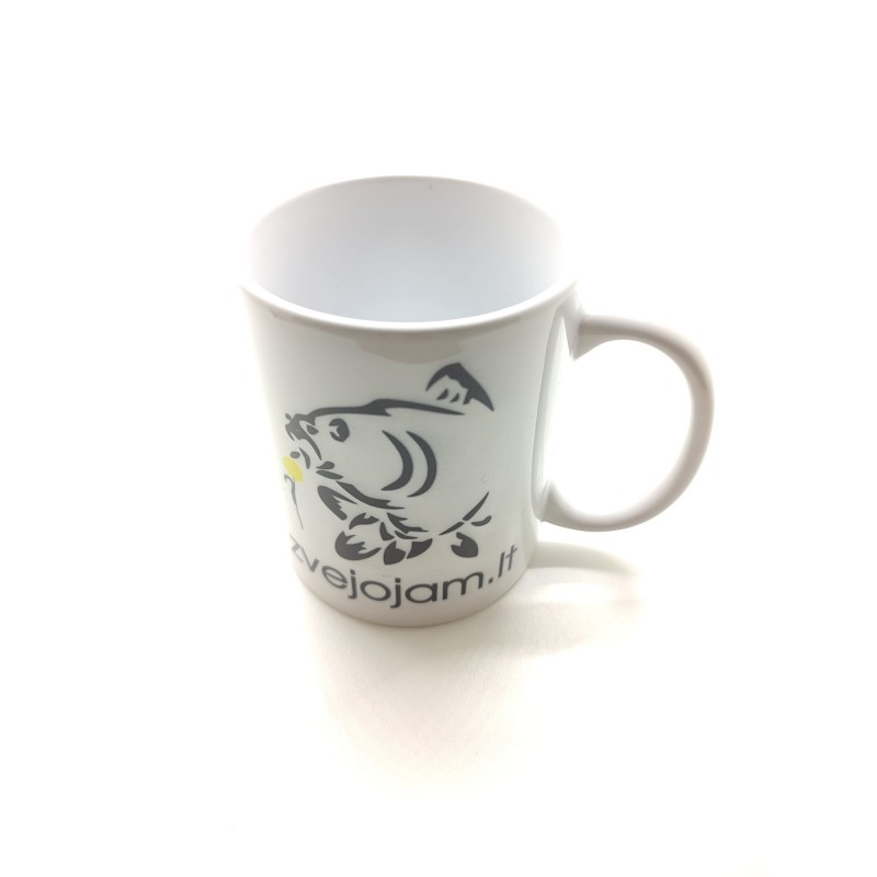 Baltos spalvos žvejybos kavos puodelis su karpiniu logotipu, puodelio talpa 330ml.